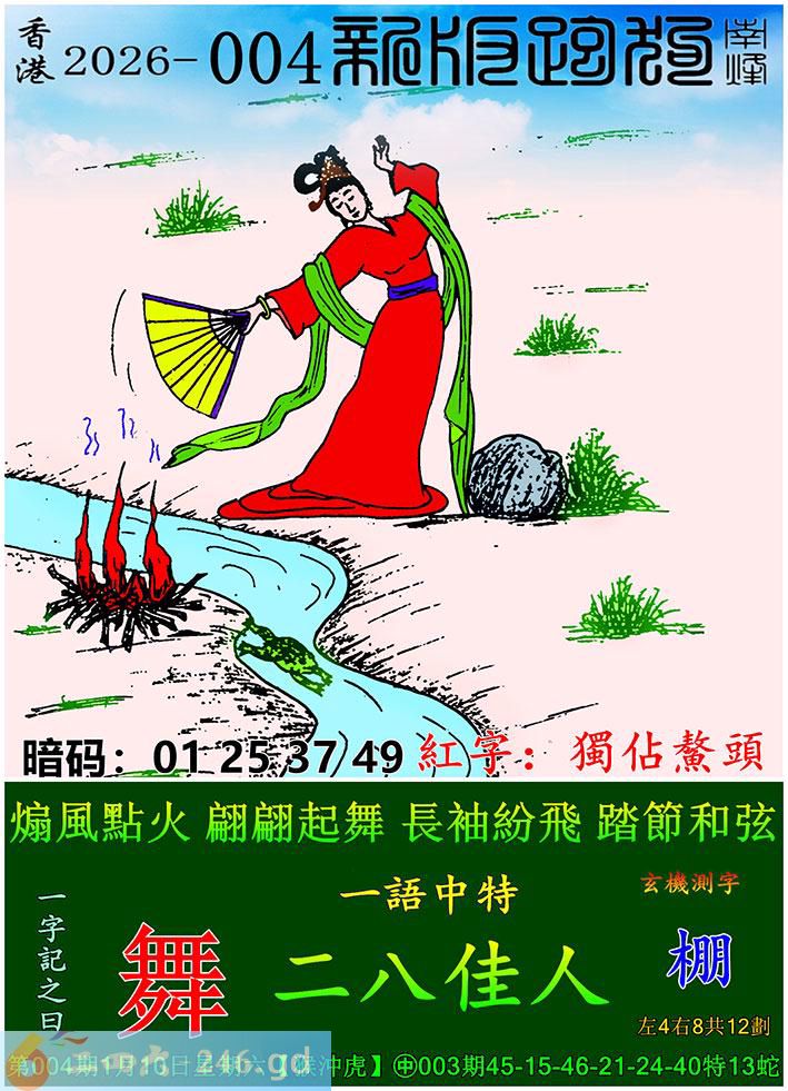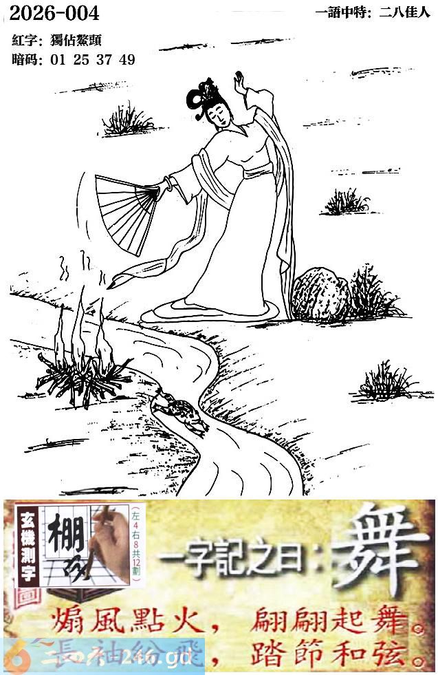 004期跑狗一字記之曰:【舞】 煽風點火,翩翩起舞。 長袖紛飛,踏節和弦。 玄機測字:《棚》 一語中特:二八佳人