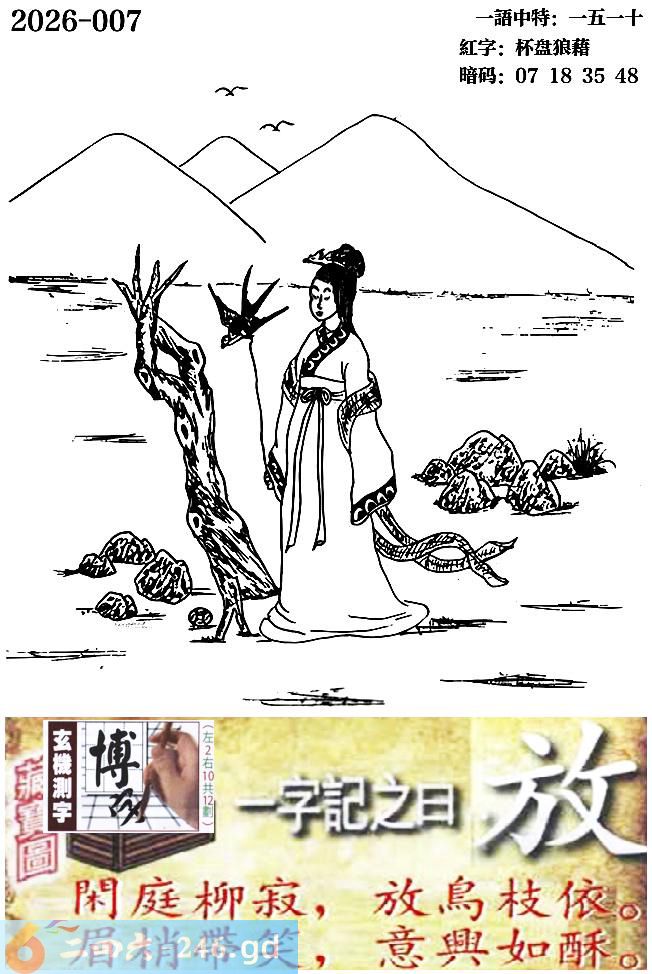 007期跑狗一字記之曰:【放】 閑庭柳寂,放鳥枝依。 眉梢帶笑,意興如酥。