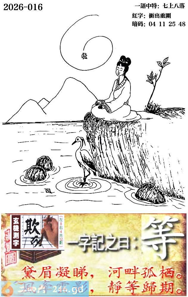 015期跑狗一字記之曰:【等】 黛眉凝睇,河畔孤棲。 風牽雲影,靜等歸期。 玄機測字:《欺》 一語中特:七上八落