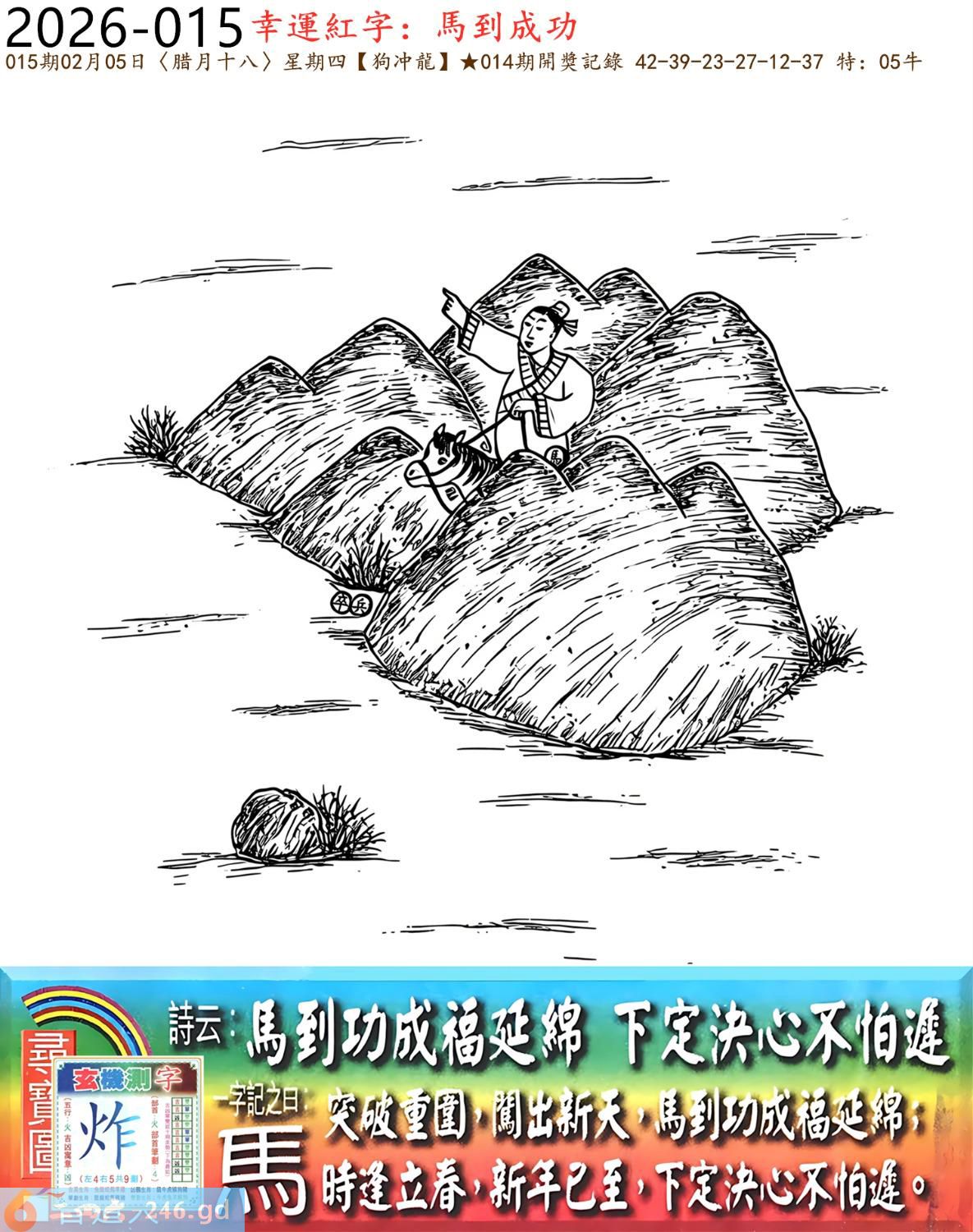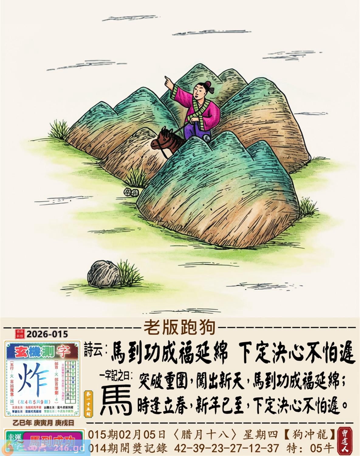 2026年2月5日015期龙(甲辰)(钗钏金) 015期:老版跑狗玄機一字記之曰:【馬】 詩云:馬到成功福延綿下定決心不怕遲 突破重圍,闖出新天,馬到成功福延綿; 時逢立春,新年已至,下定決心不怕遲。 玄機測字:《炸》 密圖詩:一臉家逼買三四 《記》:八面來風臘月會 特碼大小單雙句:小小買注二十塊 今期必中:馬岱 015期:特碼歇后語 嘴上无毛-----办事不牢 015期正版四字梅花诗:避而远之。 015期火车头:烧伤马。诗:鸡死狗伤,困龙暂且藏淤泥。 015期香港第一手欲钱料:二一。 015期曾道人说:“原油?” 015期另版四字梅花诗:四三发财。 015期香港第一手欲钱料:欲钱去看温柔可爱的动物。 015期曾道人说:“请问太阳为什么可以发电”? 015期:二字經:收藏 015期:面包是特码 015期:智力金壤;千钧一发 015期:信箱紅字:【衝出重圍】 015期:【暗碼:04-11-25-48】 015期:一語中特:【七上八落】 發財玄機圖:敏感非常弓身防禦圖中明蛇紅綠 015期:藏寶圖 新:蓬阁桃源两处分 老:江山王气空千劫 禁:马禁:7尾玄機字《象》 2026年015期【生活幽默】版 〖知音在此〗 某書生酷爱彈琴,常常感慨知音難尋,鬱鬱不樂。 一日在房中彈琴清遣,忽聞隔壁有嘆息之聲。書生大喜:"原來知音在此呀!" 歡歡喜喜地去鄰家叩門。開門的却是個老婦。老婦哭着説:"觸景生情啊,我兒子生前以彈棉花爲生,先生您彈的太像他了。"
