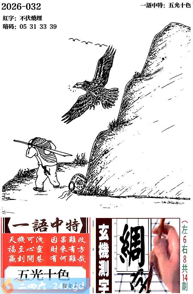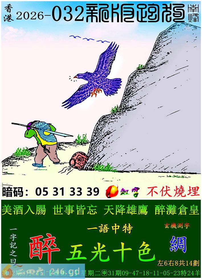 032期跑狗一字記之曰:【醉】 美酒入腸,世事皆忘。 天降雄鷹,醉灘倉皇。 玄機測字:《綢》 一語中特:五光十色