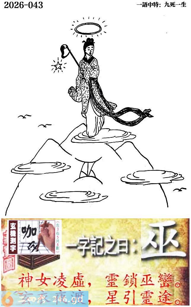 043期跑狗一字記之曰:【巫】 神女淩虛,靈鎖巫巒。 玄衣夜渡,星引靈途。 玄機測字:《咖》 一語中特:九死一生